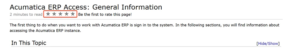 And don’t forget—you can rate each topic page! Your feedback helps us improve the documentation and make it even more useful for you. To learn more about topic ratings, see: Help Ratings.