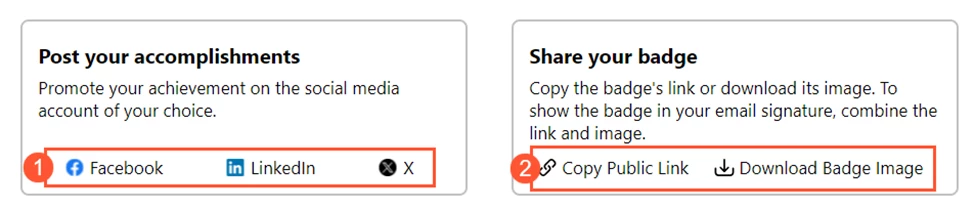 Share your badges to your professional profiles, email signatures, or social media. In the lower section of the Digital Badge tab, select the option you need: share to the selected social media (see Item 1 in the screenshot below) or download the badge image and copy the link to the badge for other sharing methods, like email, chat, or a signature (Item 2).