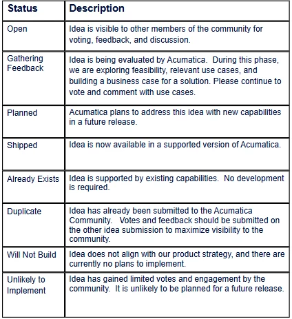 Great News - we've made it easier for you to track your ideas. We've simplified how we categorize them - so now there are fewer, clearer options. That means you'll be able to see exactly where your suggestions stand. Check out the chart below for a breakdown of the statuses and what they mean.