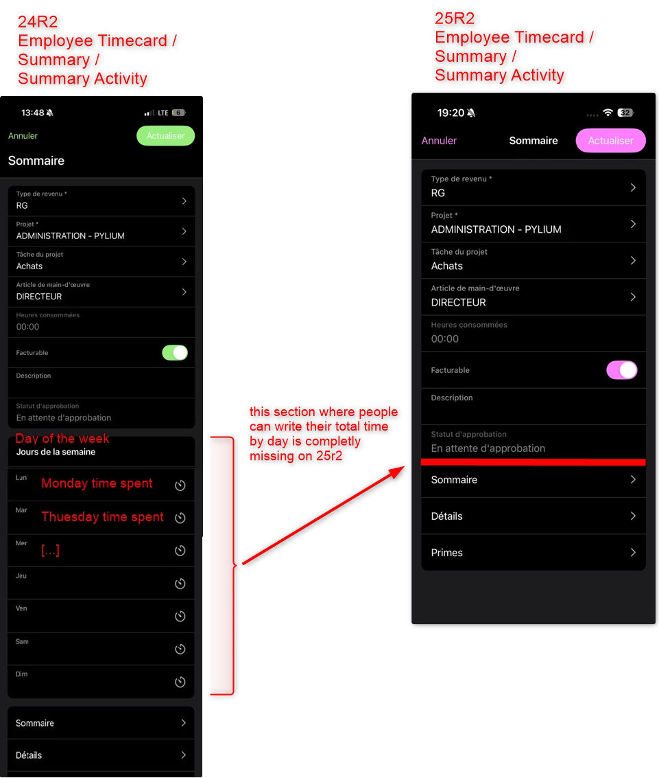 In 24R2, users can enter their time spent per day of the week directly in the Summary Activity section (see left screenshot). However, in 25R2, this entire section appears to be missing, even without any customization published (right screenshot).