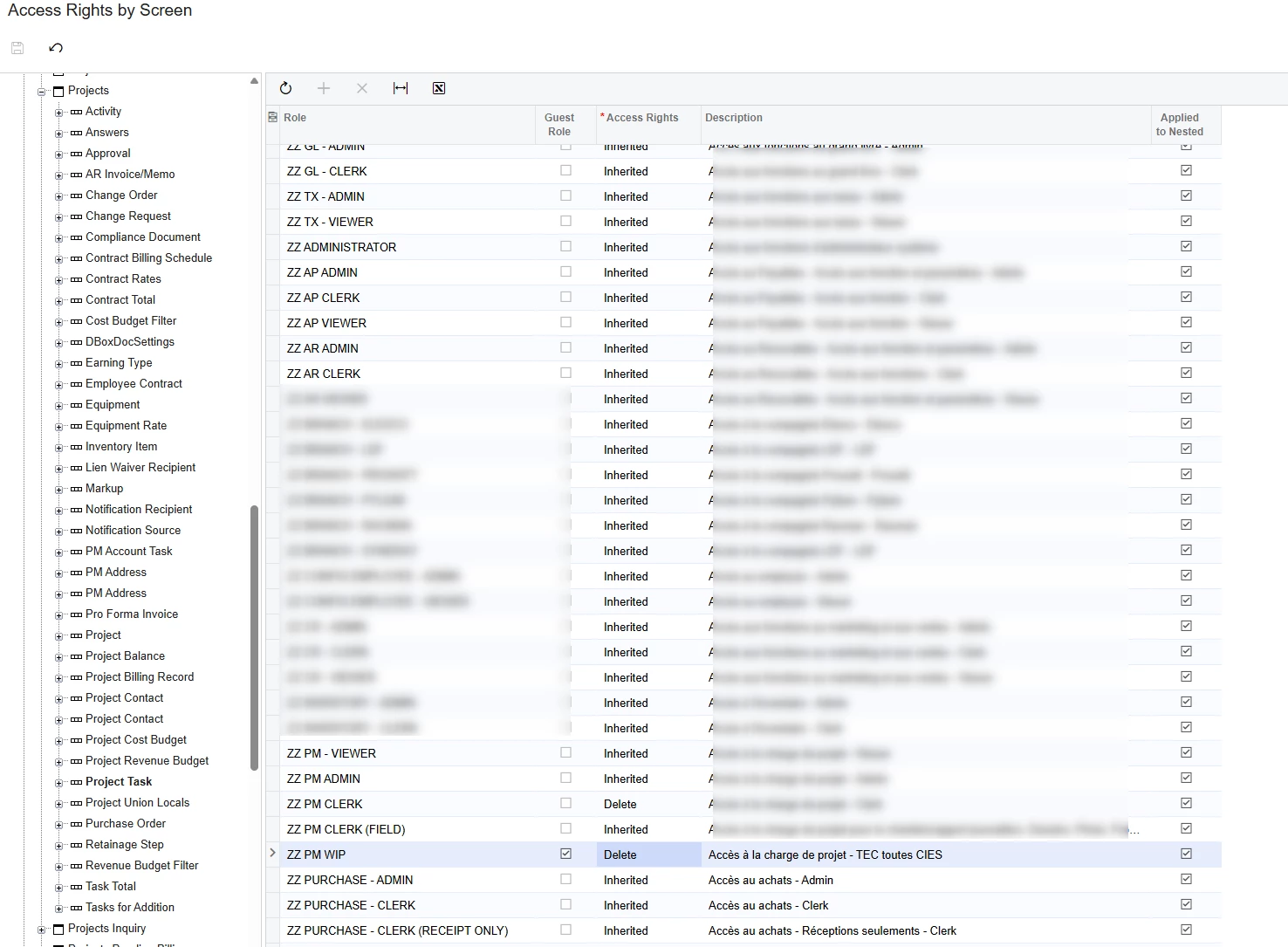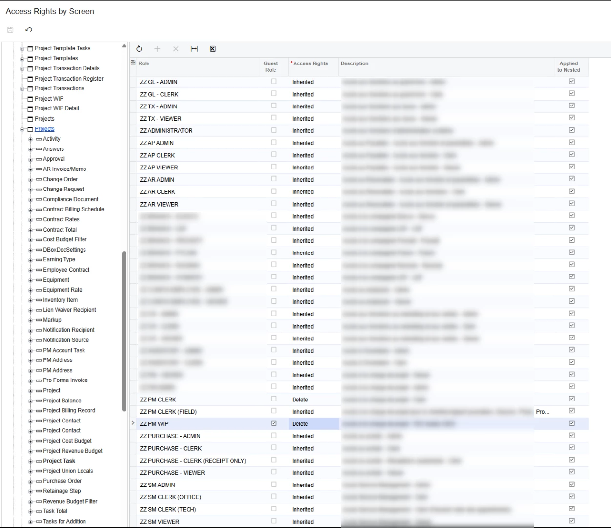I’ve tried setting “Insert” access for the Projects screen and “Delete” for the related detail screens (Project Task, Project Revenue Budget, and Project Cost Budget), but users can still delete existing records.
