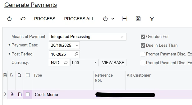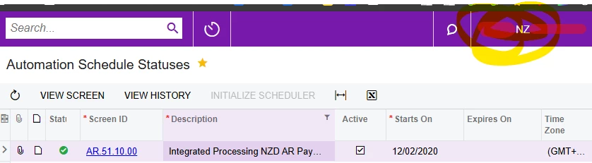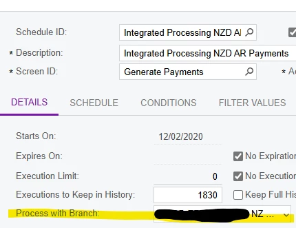 Because the Autom. Schedule History tells no records processed and if I open the screen with the default branch, it doesn’t show the NZ records.