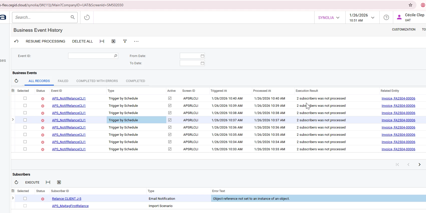 => When I retry to sent the email with business event history resume and rexecute, it works totally.