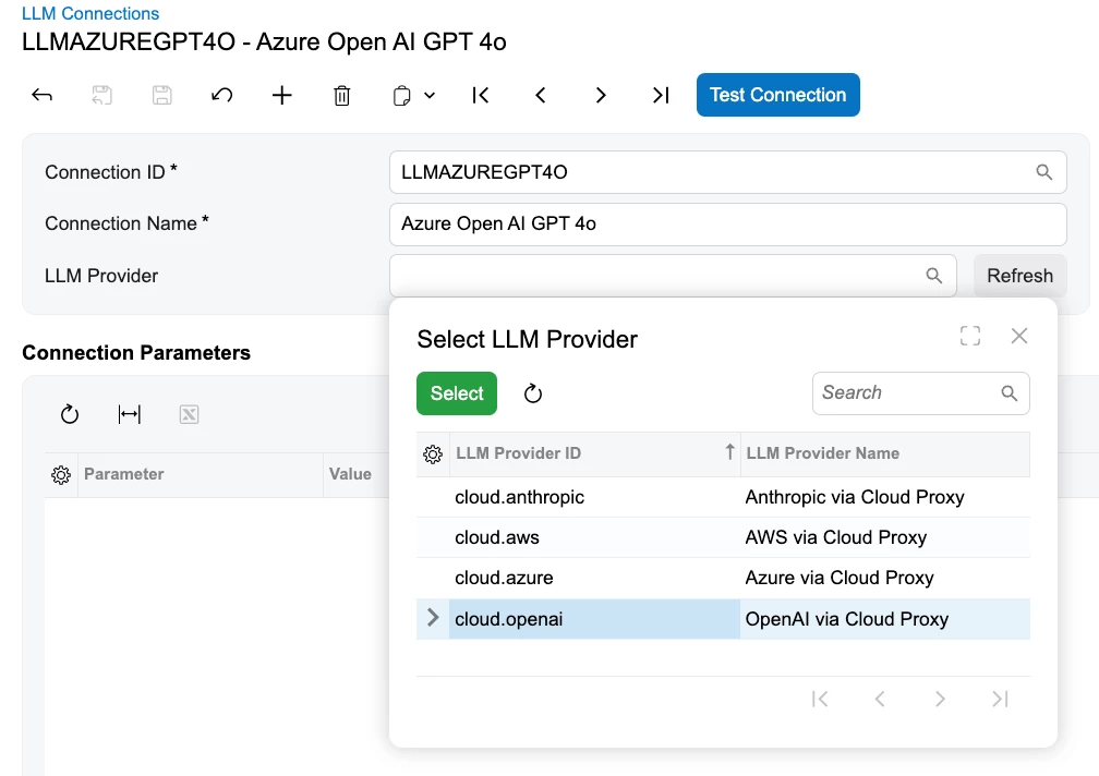Step 4: Click Refresh next to the LLM provider menu so the system can dynamically create a list of the latest supported providers from the Acumatica Secure Cloud service.