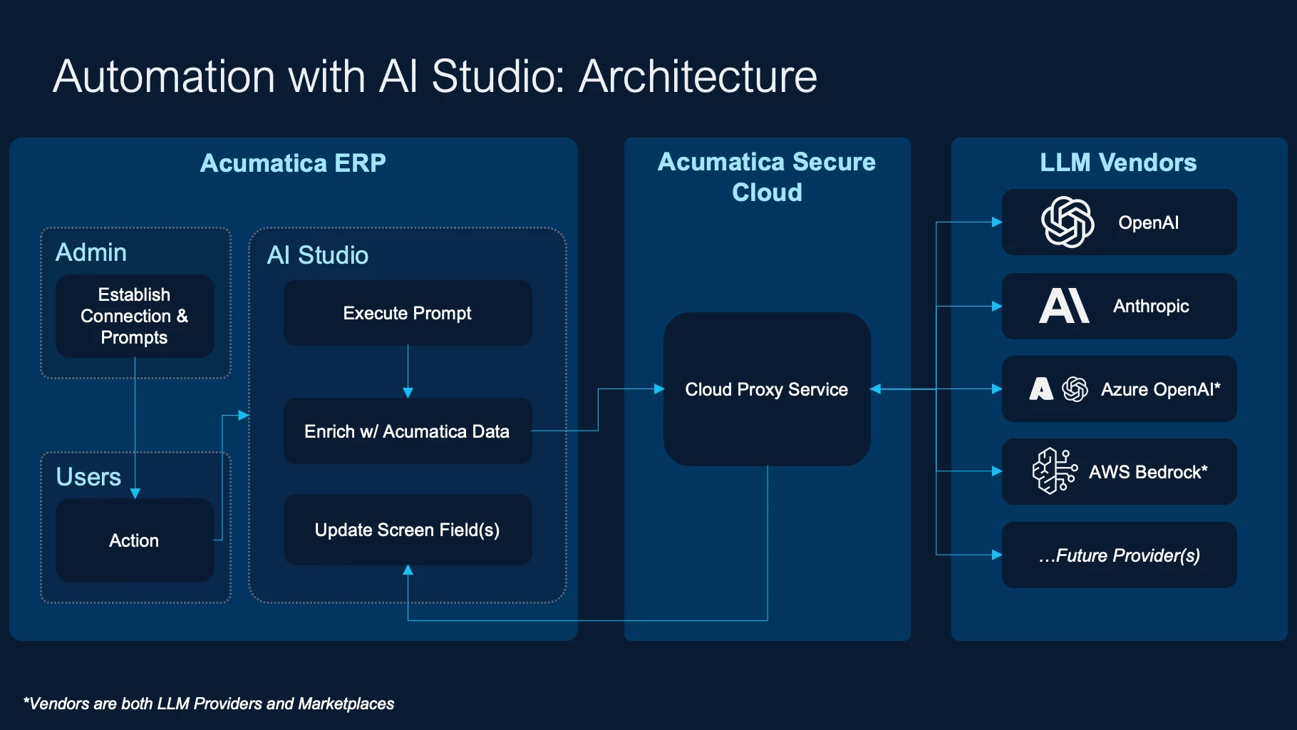 AI Studio communicates through the Acumatica Secure Cloud, a proxy server that forwards the prompt to the selected large language model (LLM) provider. The request and the AI response are transmitted securely between Acumatica ERP and the LLM provider. Below is a high-level architecture overview of AI Automation with AI Studio:
