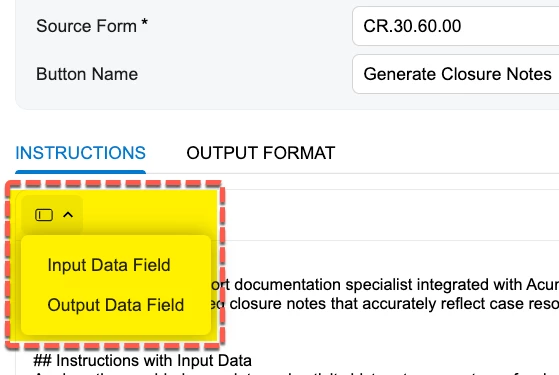 Use clear, specific, and concise instructions. Avoid ambiguous language and ensure the field names match the document’s terminology. For best results, use the Input and Output Data fields buttons