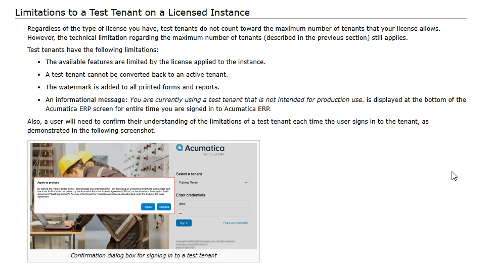 “Also, a user will need to confirm their understanding of the limitations of a test tenant each time the user signs in to the tenant, as demonstrated in the following screenshot.”