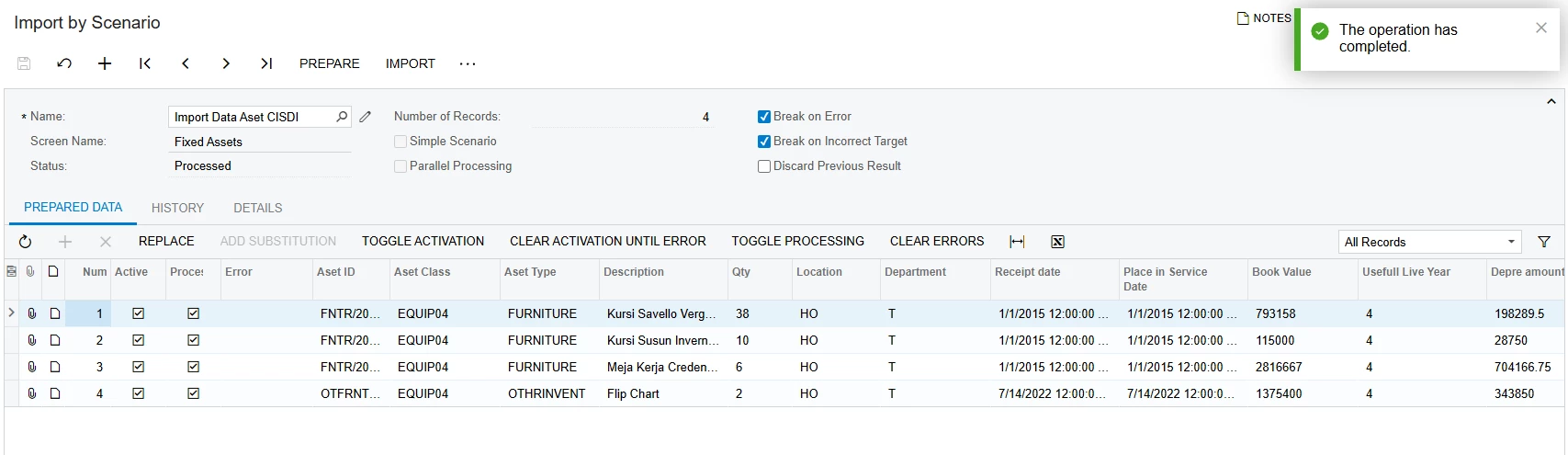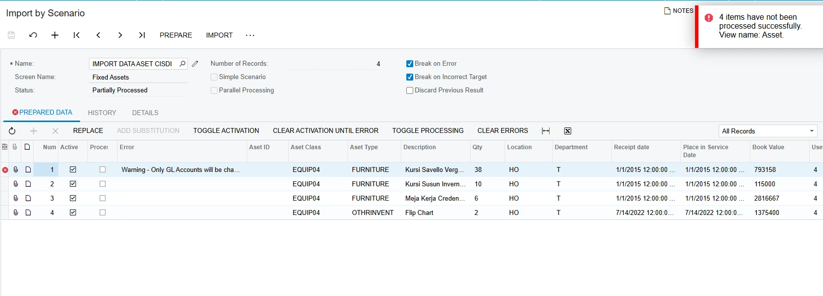 Hii, i want to try import some master data of fixed asset in Acumatica, using Import using Scenario. Bu when i try to import, there is an error but more like warning like this “Warning - Only GL Accounts will be changed, all other parameters remain unchanged. Do you want to continue?” But there’s no action option like Continue or Yes. Please somebody help me to solve this, please😣