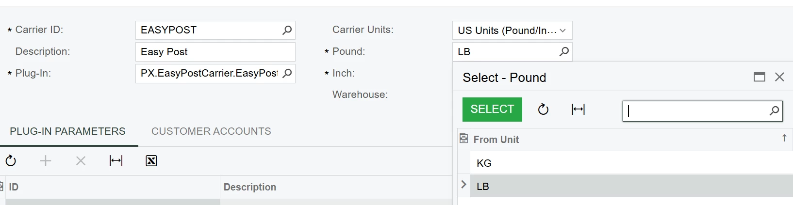 We are trying to create a new carrier for Easypost, and choose US units (Pound/Inch) for Carrier Units. Both the LB (Pound) and IN (Inch) were defined in the Unit of Measure, however, only the LB is available for Pound, but the IN is not available for Inch in the Carrier Units section. Does anyone experience the same issue? Any suggestion would be greatly appreciated.