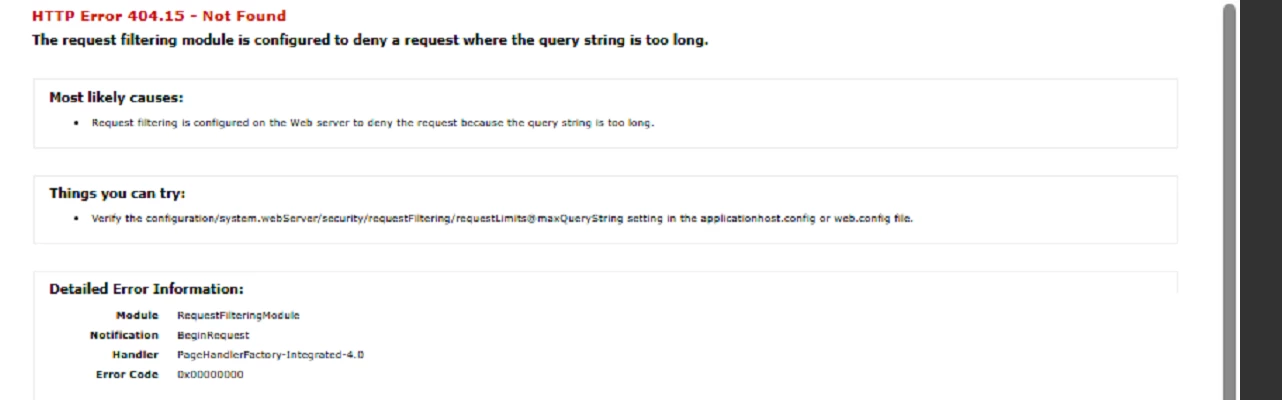 Modified the Maximum Query Length setting at the IIS level