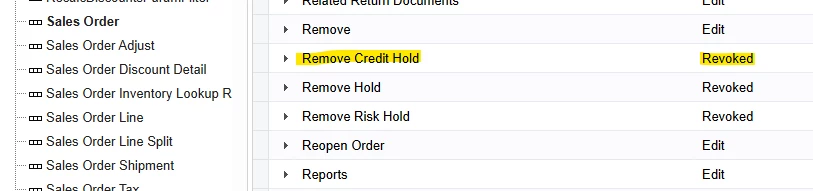 The user “testorder” only belongs to this role which allows access to sales order functionality but revokes the remove credit hold function. But logging in as testorder I can still release any credit held order with the button.