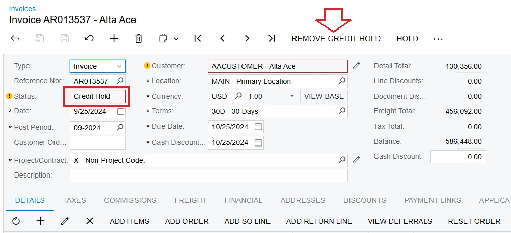 Step 2: Now the status of Invoice is "Credit Hold" > Click "REMOVE CREDIT HOLD" > Then Click "RELEASE"