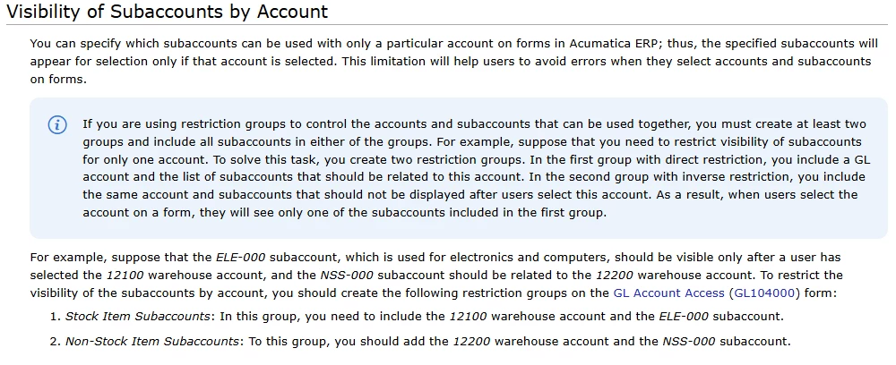 A client is requesting restriction groups to limit what accounts/subaccounts can be used with each branch. I have this mostly configured but they would also like: when a user selects a certain GL account, only 1 subaccount should be available for selection. So, for example, the user selects account 123456, only the 1000 subaccount is available. The catch is, they still want to be able to use the 1000 subaccount outside of the GL accounts that it’s required for. I set up 2 restriction groups per this knowledge base article: