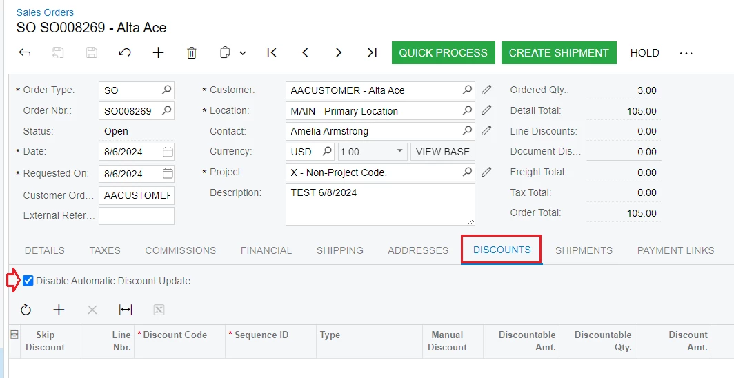I created a Discount Type (Group), a Sequence, and applied it to my customer. Now it auto-applies this discount on every sales order for that Customer. I just want it when it is asked for directly by the user. I assume I’m just overlooking a toggle somewhere.