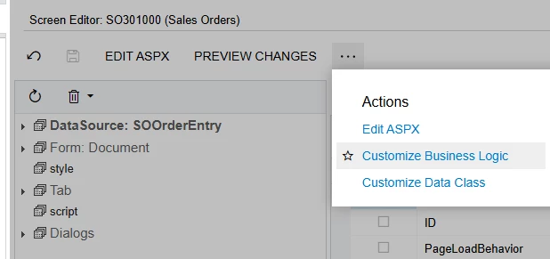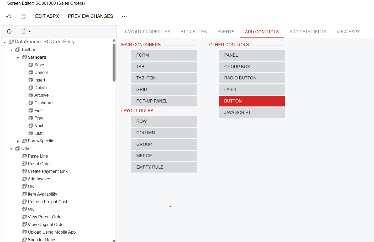 Expanded DataSource: SOOrderEntry → Toolbar → Standard