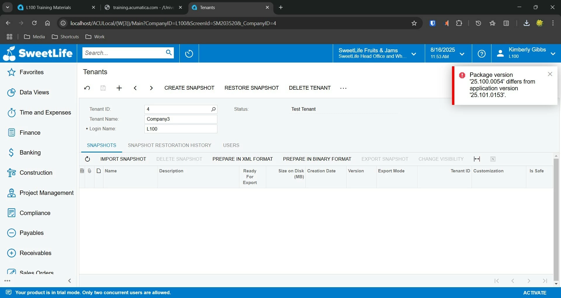 The current tenant is already loaded w/ U100 as can be observed by the Gibbs user, but I don’t believe that should pose an issue given I am only trying to import the snapshot at this point.