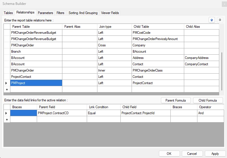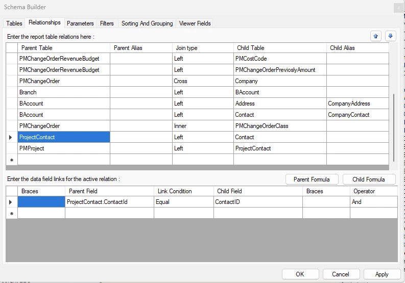 Our company would like the Printed Change Order report (PM643000) to include the architect contact information and signature line like it exists for the contractor and owner. I understand how to add the signature line and the conditional statements for contact information but I’m not sure how to access the actual data for the architect contact data.