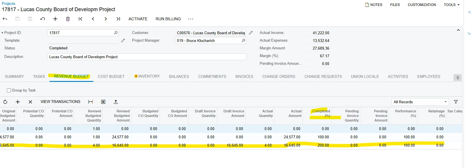 I configured an automation schedule for the Run Project Billing process. However, several of the projects that were completed still generated an invoice even though the items were billed already. I did know for several line items this happened on after Run Billing was done the completed % column like below increased from 100% to 200% causing an invoice to happen. The billing rule is set to Time & Material .