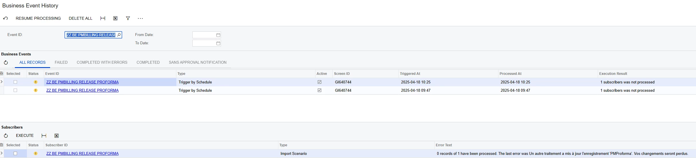 "0 records of 1 have been processed. The last error was: Another process has updated the 'PMProforma' record. Your changes will be lost."