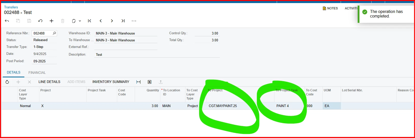 There is not a Reason code on the transfer.  However, when we go to issue it out of a project, it will not create the issue. I’m guessing due to the task, but then the inventory item is stuck in the project in perpetuity. I guess the main issue here is that it is allowing transfers.