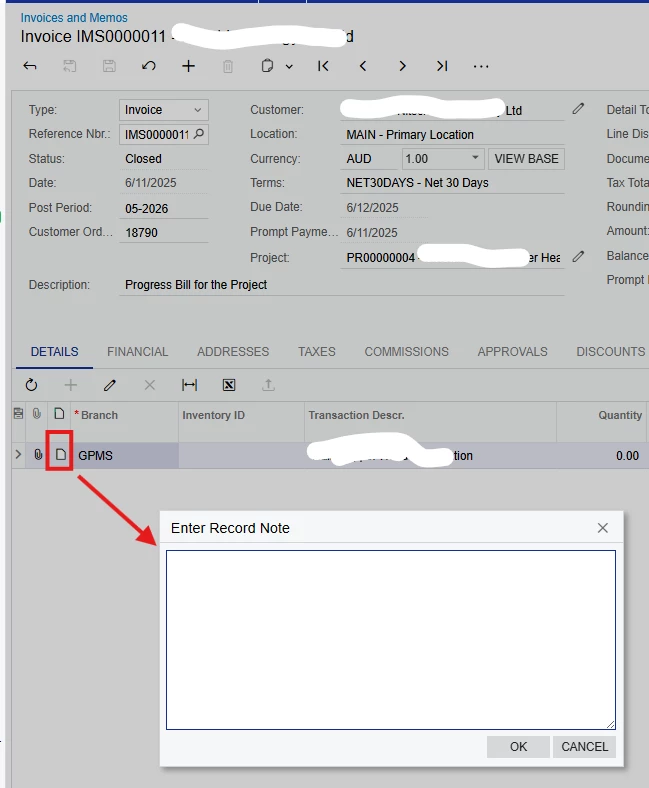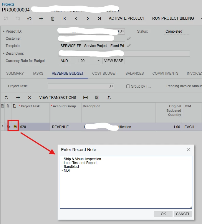 Hi, is it possible to automate the copying of notes from revenue budget line of a project to Invoice when running project billing? Do you think this can be done via business events?