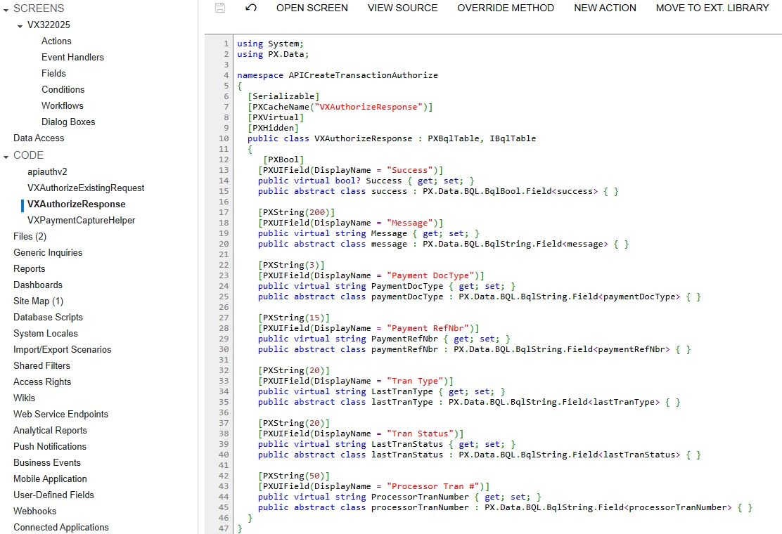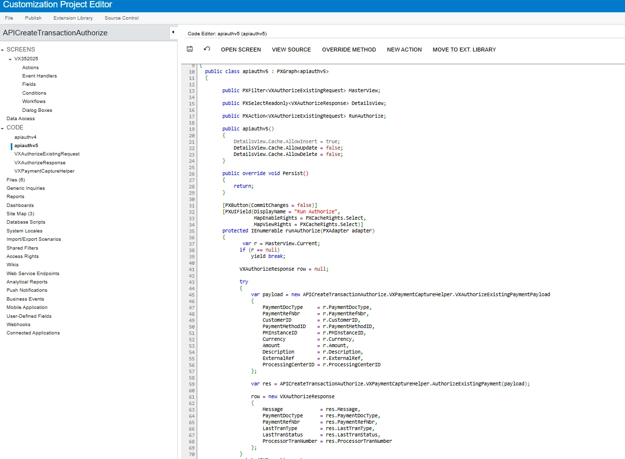 I'm building a custom API screen in Acumatica with a virtual DAC (PXVirtual) to trigger an authorization process.