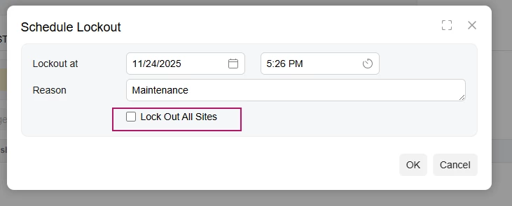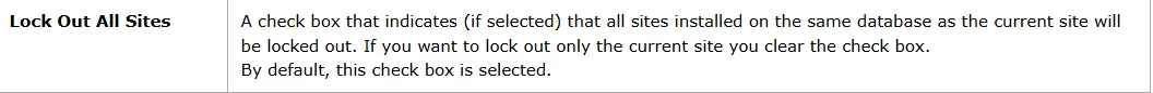 “Lock out all sites” on the Maintenance Mode pop-up is a way to lock out other sites that are connected to that database, such as for high availability environments running in a cluster (also known as a processing node), perhaps even for portal sites which also is a separate site connected to that same database.