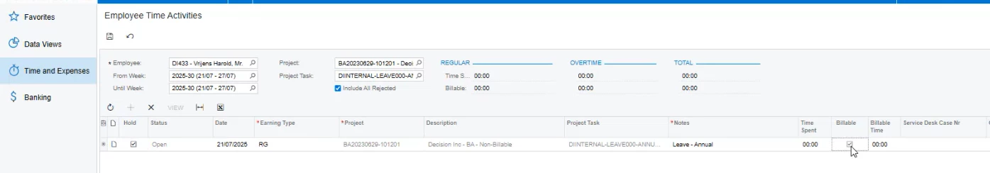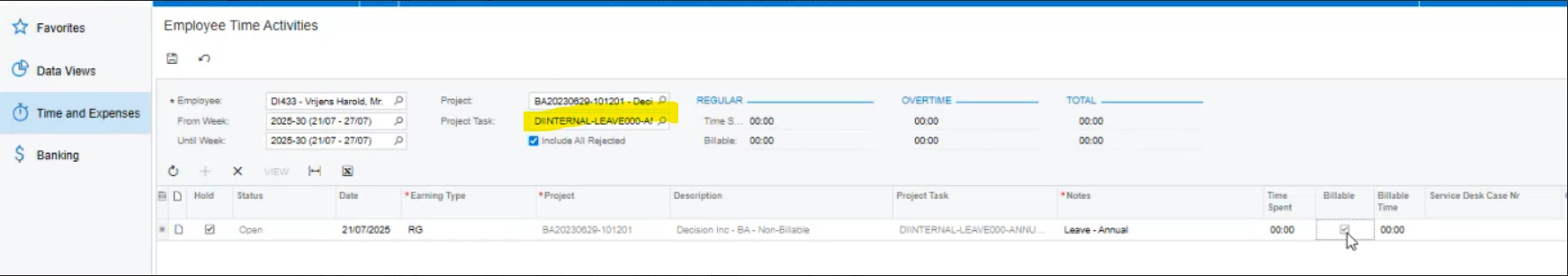 With reference to the screenshot that i just sent, when the task ‘Internal leave’ is selected on the Project Task field highlighted then again on the transaction line, the billable field on the line is greyed out and marked billable which is incorrect as the task should be non billable.