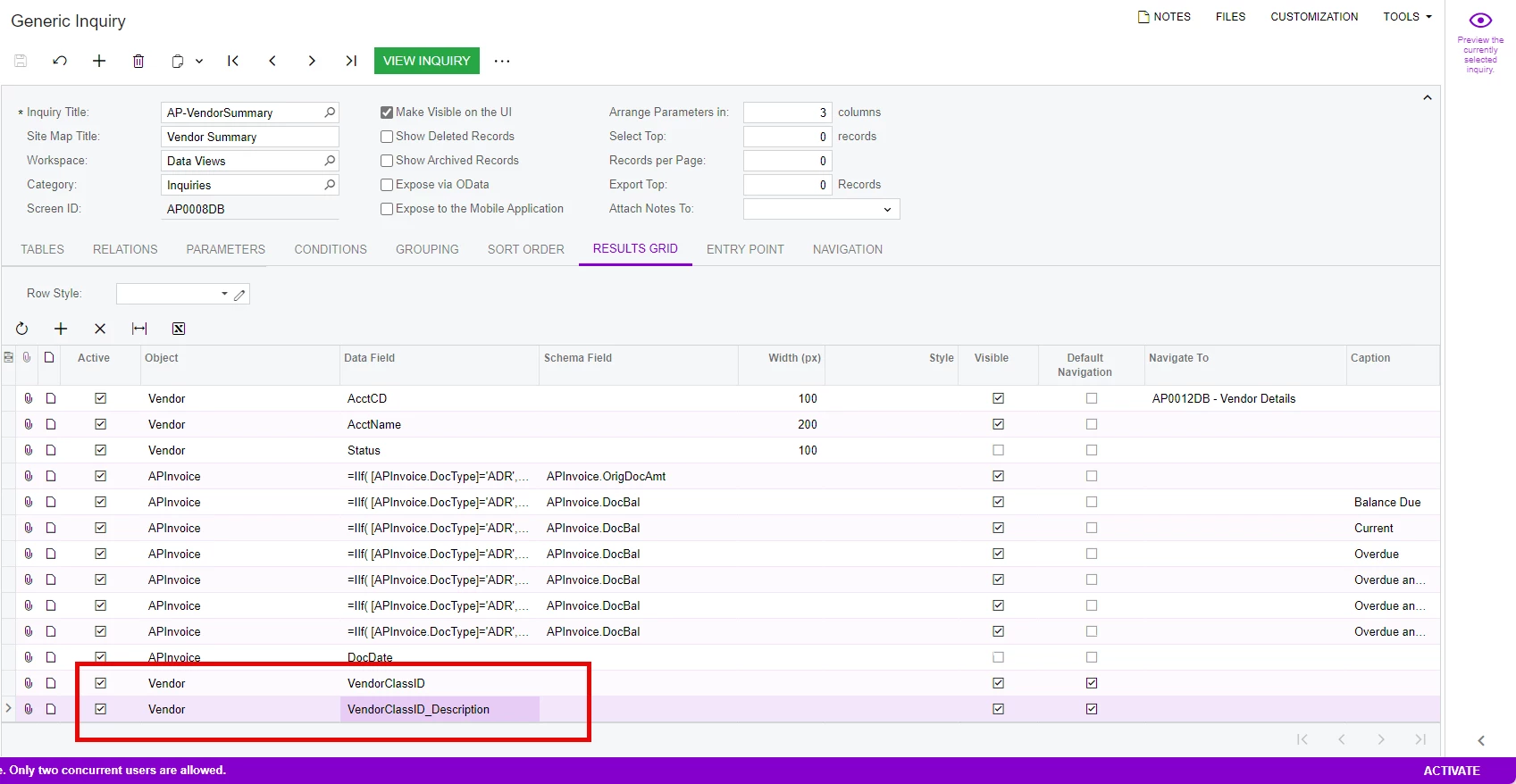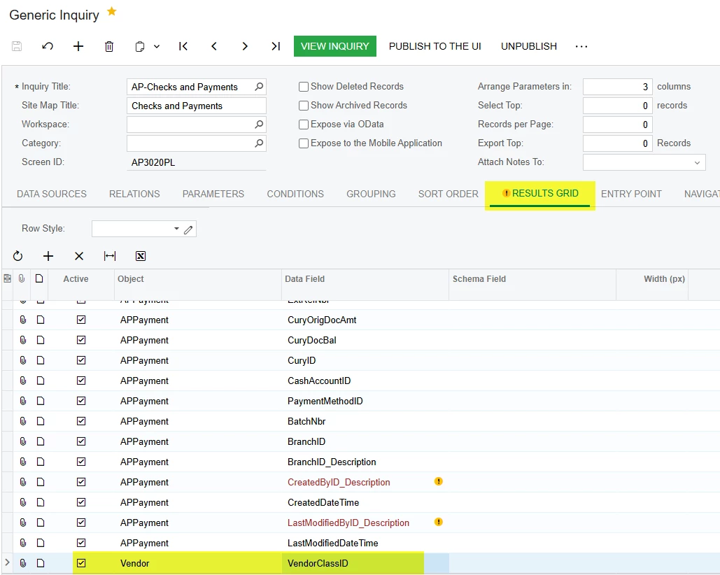 then on the inquiry i went to results grid and added a row which Object = Vendor and data field = VendorClassID: