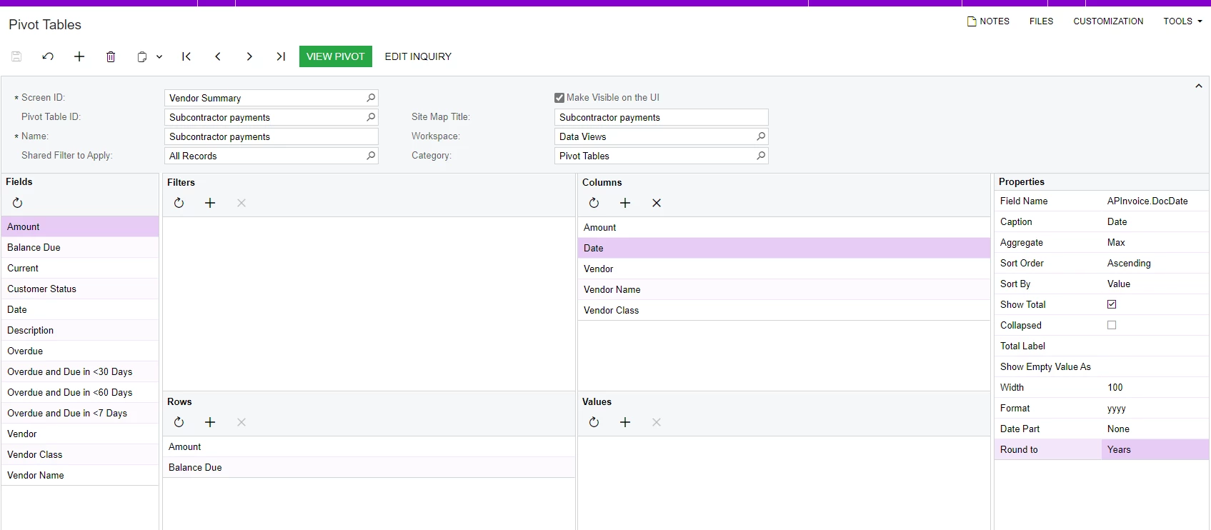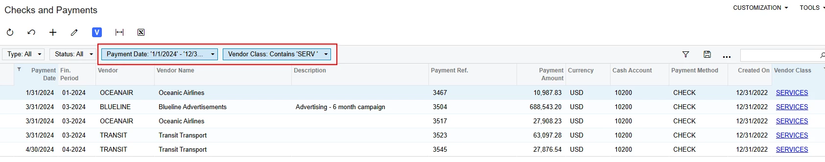 then you can filter on the vendor class as well as put a date range for the payment date column and it should give you what you need (in my example i used services instead of subcontractors, but use the ID that you are trying to filter by):