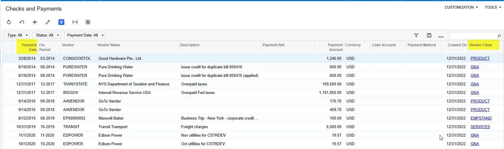 Payment History Report by Vendor Class