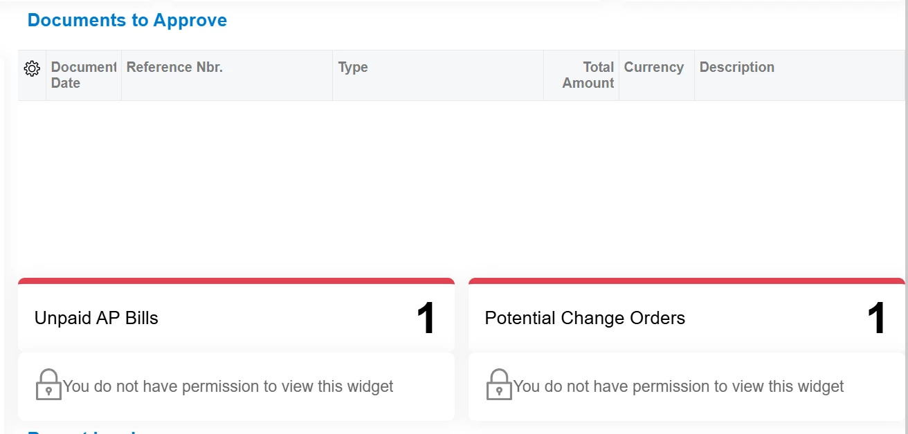 If you click into the “Unpaid AP bills” tile it takes you to the Approvals page, where I have access to. And the “Potential Change Orders” tile takes you to the “Change Orders “ screen which I also have access to.