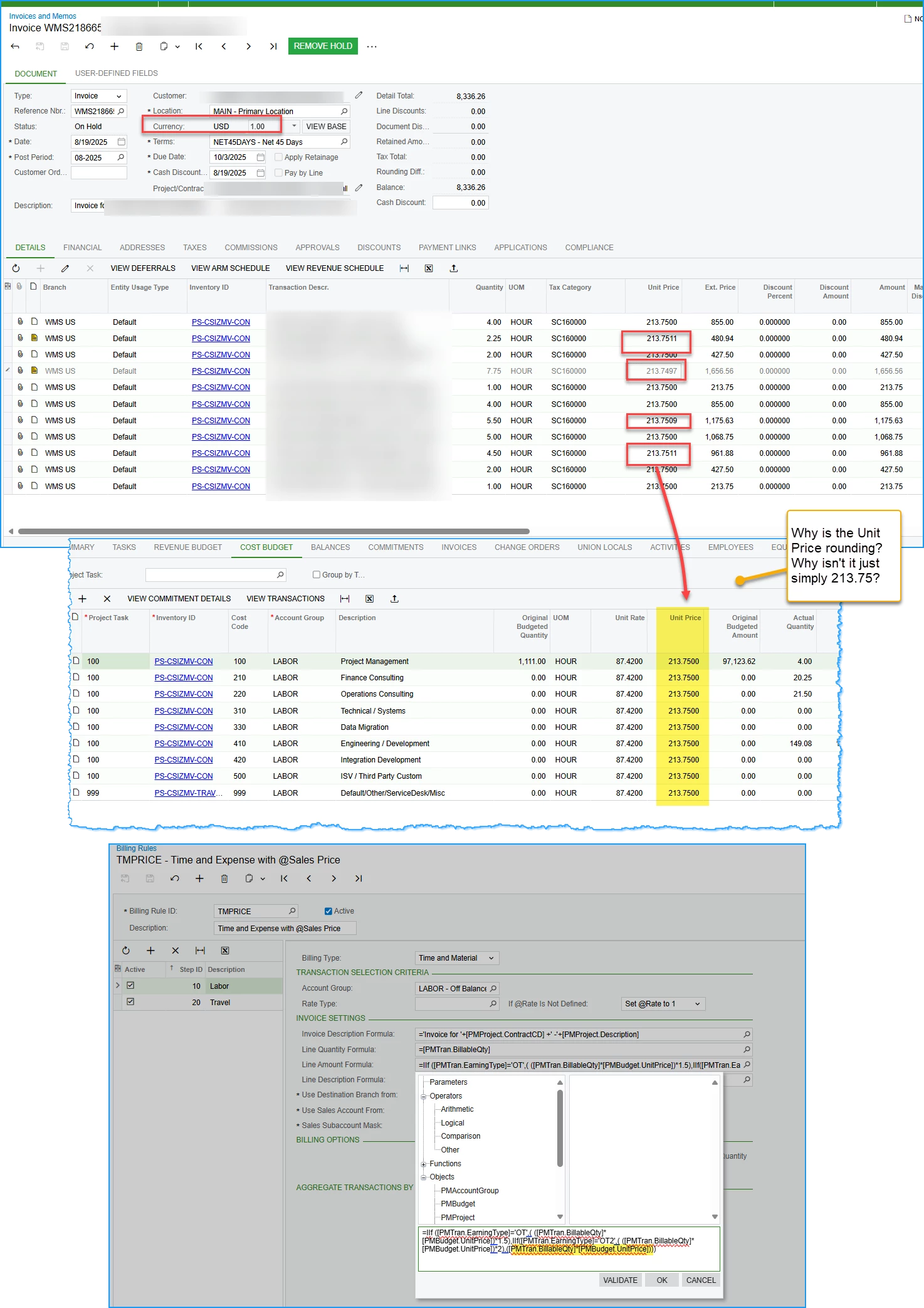 Whenever the quantity to bill does not end in .00 hours, the Unit Price on the Invoice is calculated to some other value. There is no currency involved. What would be causing this?