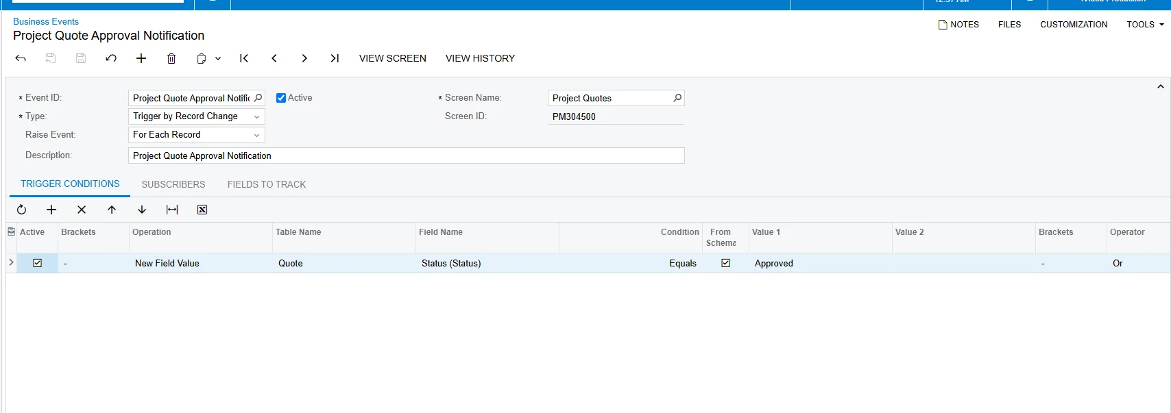 I created a business event for a client to alert users when their project quotes have been approved. It’s working but many users will have to make edits on a regular basis and the business event triggers an e-mail again after making edits. What condition can I use to trigger the e-mail to be sent once and not after each edit. Here is my configuration: