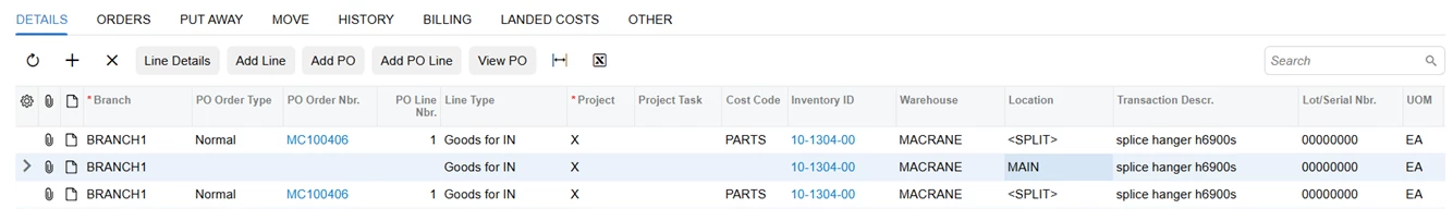 - <Enter Receipt> from the PO Screen – this builds the Receipt entry from the PO and does all the settings. Detail Lines to not have a Default Location. They do have a Default Warehouse