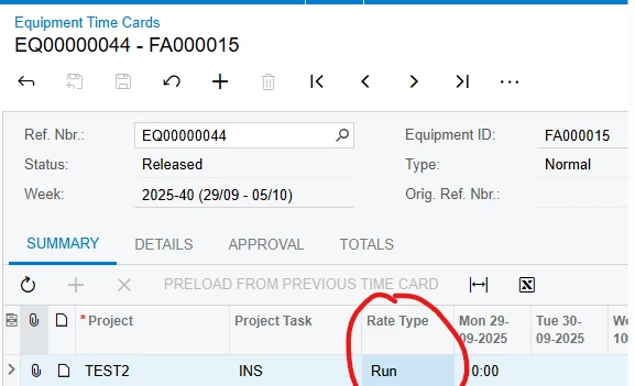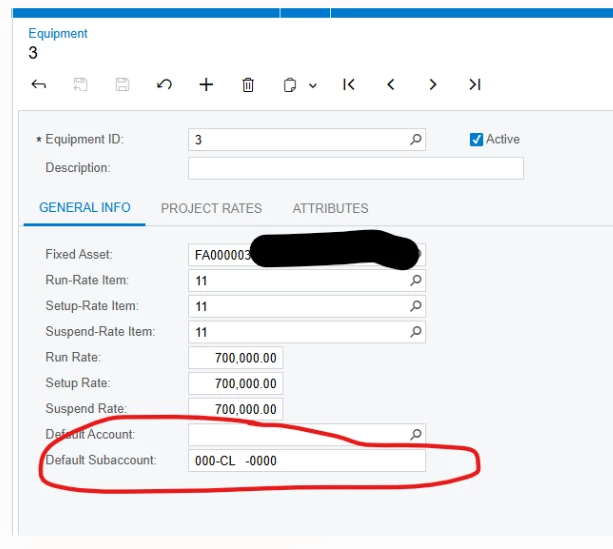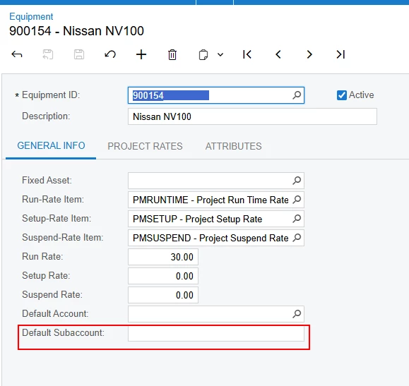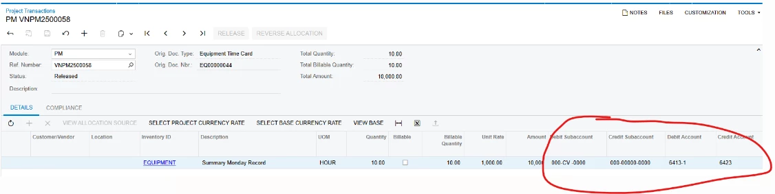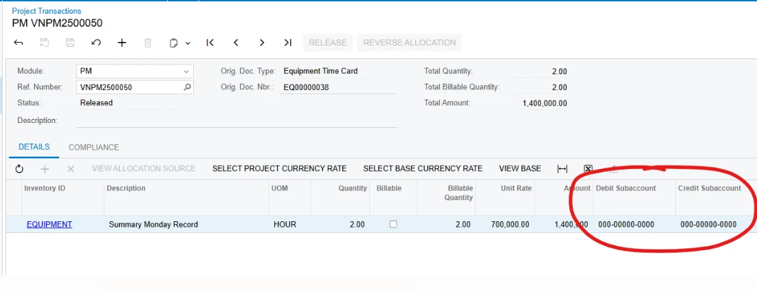 After release Equipment Time Card, the system generate a Project Transaction with default Subaccount as imaged