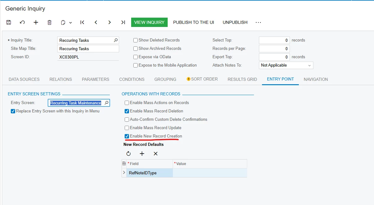 I created a generic inquiry and replaced a screen but setting the “Enable new record creation” to true in the menu, I still don’t get the + button