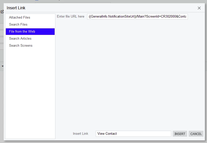 ((GeneralInfo.NotificationSiteUrl))/Main?ScreenId=CR302000&ContactID=((REPLACE THIS WITH DATA FIELD FOR CONTACT ID#))