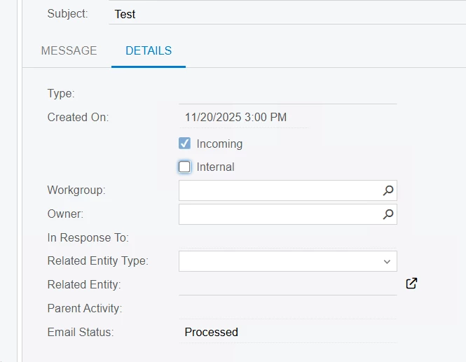 I’ve added an email address as a customer contact. When receiving email from this contact, Acumatica is not associating email activity with the contact. When I click “Create Case” from the email, the contact and business account fields are blank. I expect them to default.