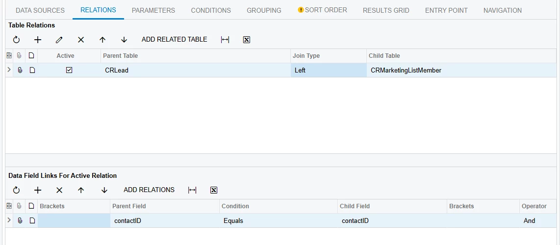 The easiest way to do this would be to take the GI that you’re using for the dynamic list, set it as the parent table in a new GI, then link that GI to the CRMarketingListMember table. Your parent table must have the contactID field so that the join works. Here’s an example with the Lead table.