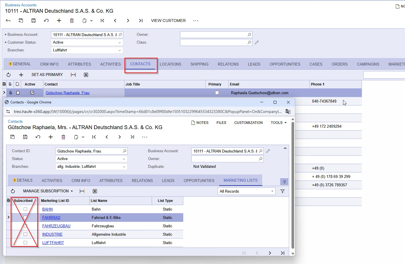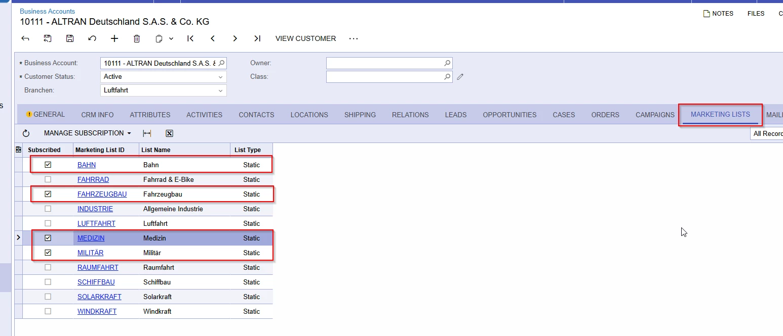 For example we have the following Customer/business account, with the following Marketing-lists checked;