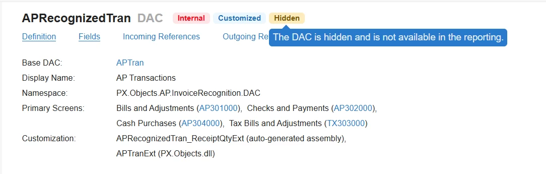 The problem is that the APRecognizedTran DAC is labeled as hidden, so I can’t access it.