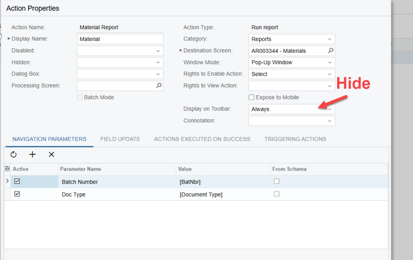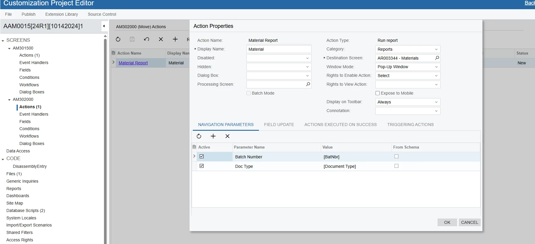 I am trying to add a report to a screen via a Customization Project, however, despite following the instructions I could find online, the new report doesn’t appear as a option. Here is the screen shot of the action I created.