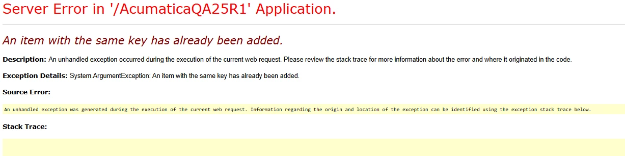 My modern UI screen was running on 25R1 version 25.093.0036, After update the Acumatica version 25.100.0054 and build Modern UI screen getting error “An item with the same key has already been added.”