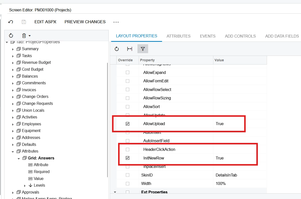 - On the Customization project, set AllowUpload true and InitNewRow True
