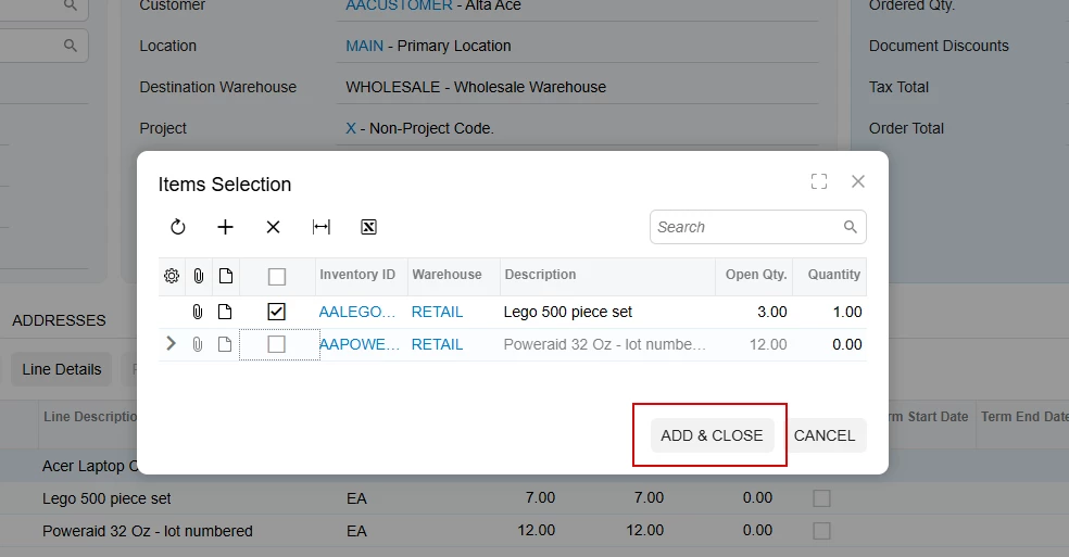 When I click the ADD & CLOSE button, I receive the following message on the screen.