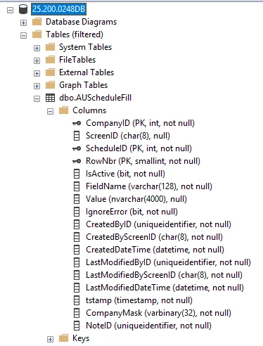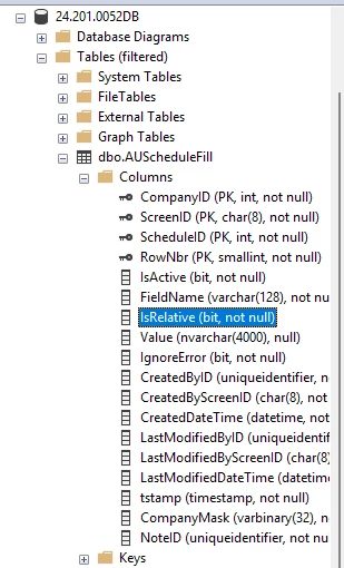 - Inspected the `AUScheduleFill` table schema to confirm `IsRelative` is NOT nullable.
