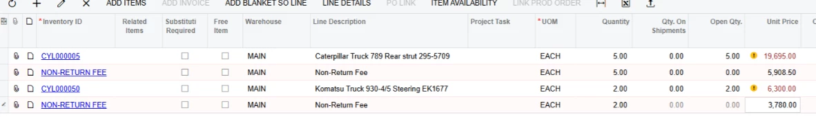 Hi I have a working customization on the sales order screen which automatically creates a new line with item “NON-RETURN FEE” if the item class of the previous line is “CYLINDERS”. This then also populates the quantity of the line above to the NON-RETURN FEE line and also copies a UDF value from the given item to this auto generated line. This functionality works but the records gets auto-populated only on pressing the save button.