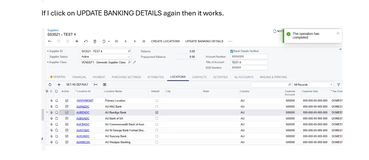 The reason it works after the second click is that the update has already been completed—this could be from your code or even from Acumatica’s own processes. However, you still need to ensure you’re retrieving the latest Location record whenever you interact with it.