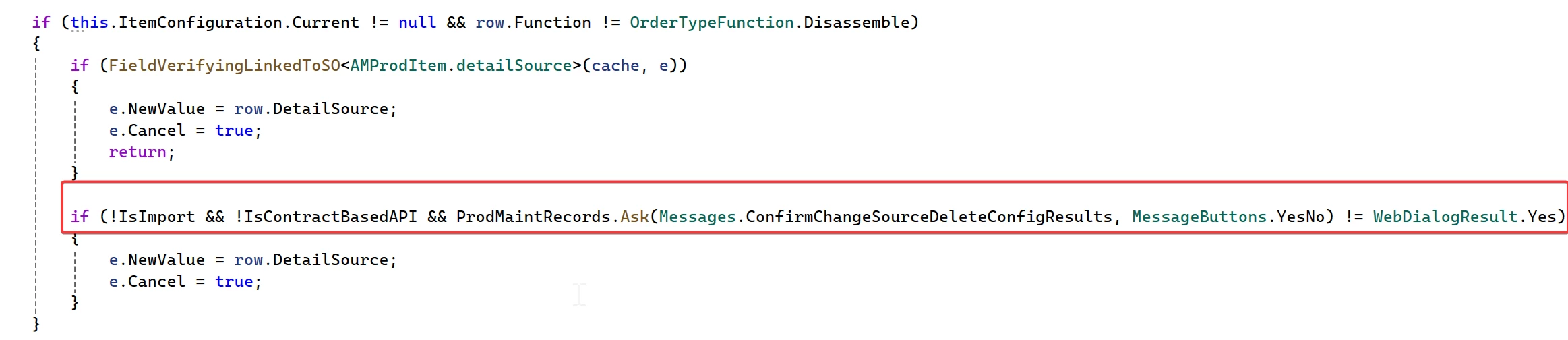 protected virtual void AMProdItem_DetailSource_FieldVerifying(PXCache cache, PXFieldVerifyingEventArgs e) { var row = (AMProdItem)e.Row; if (row != null) { var newSource = (int?)e.NewValue;
